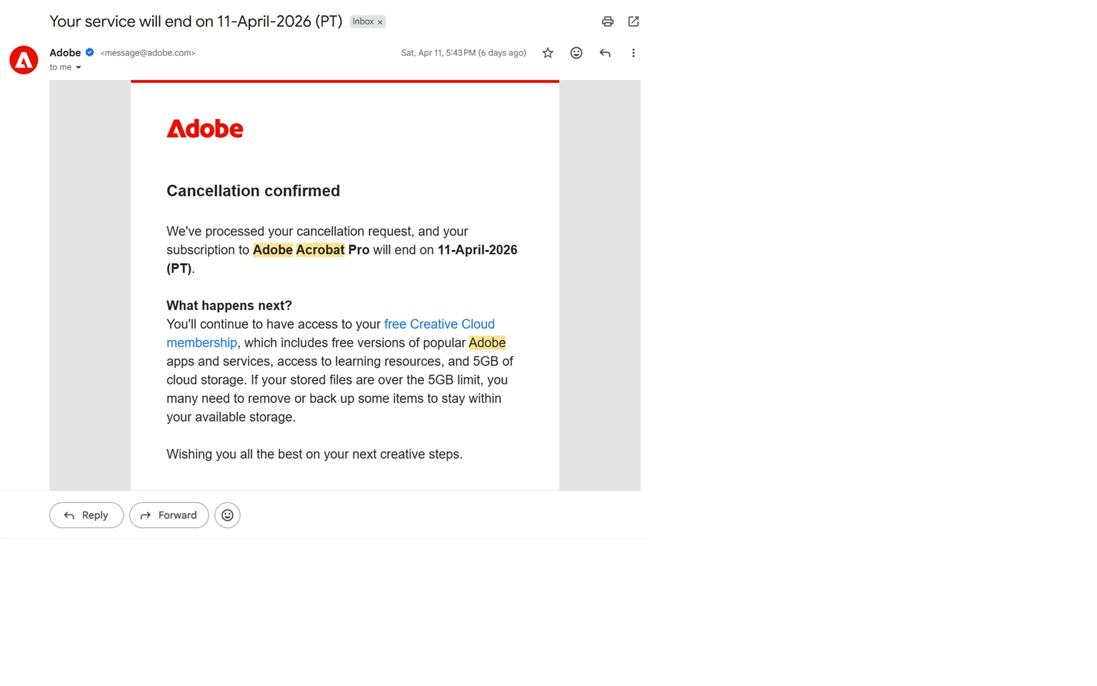 After I received confirmation email that my subscription has been cancelled on 11th of April I got charged 5.14EUR on 15th of April and Adobe tried charging an additional 23.99USD on same day, 15th of April, but luckily for me I didn’t have enough funds that day.