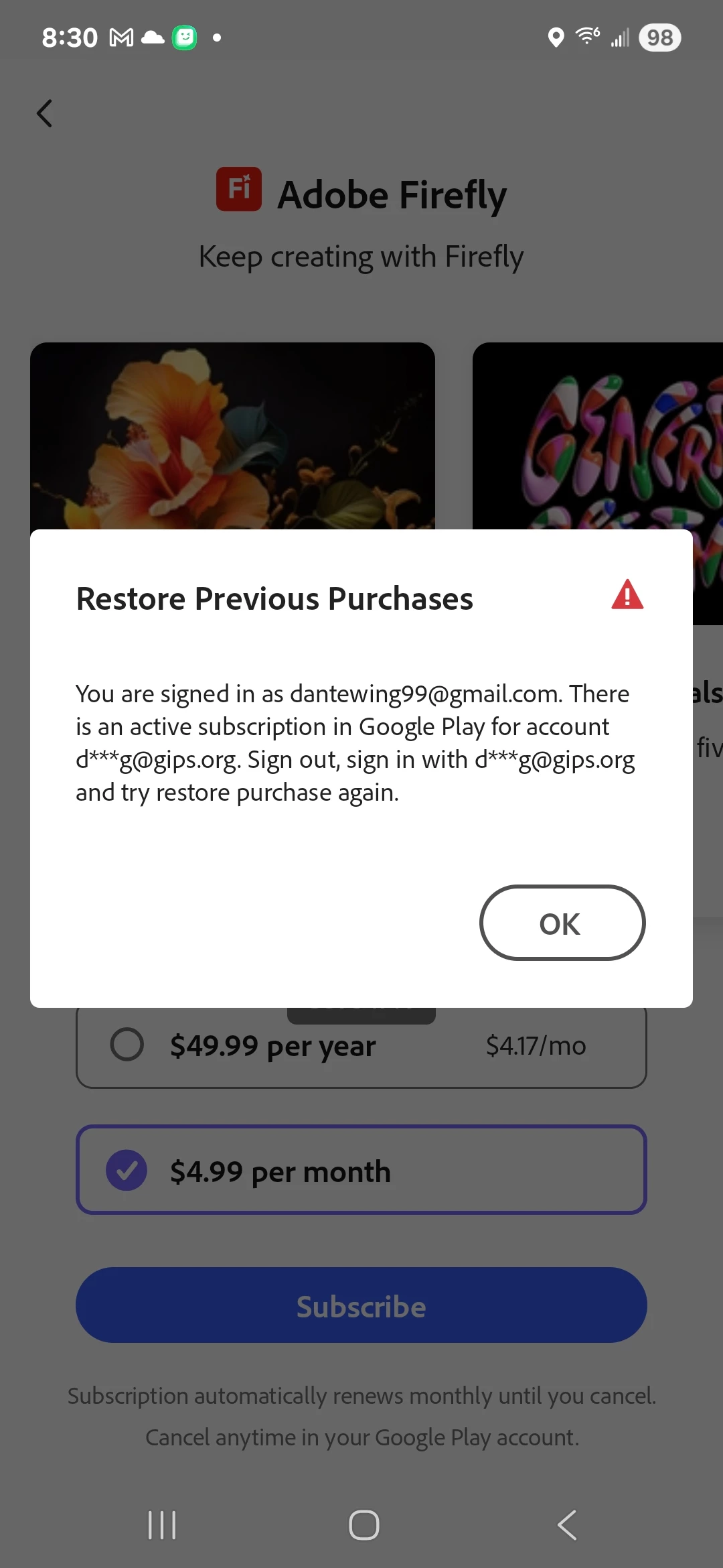 I wanted to restore my purchases from my new email account, but I subscribed to my old email account instead.