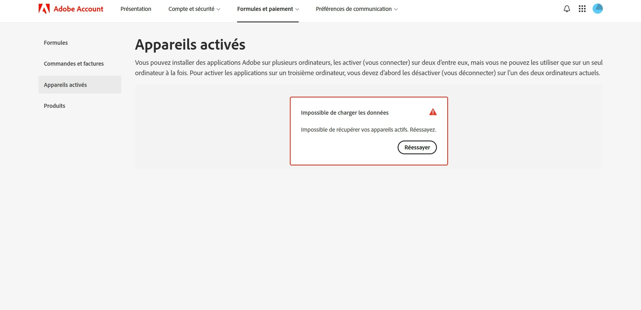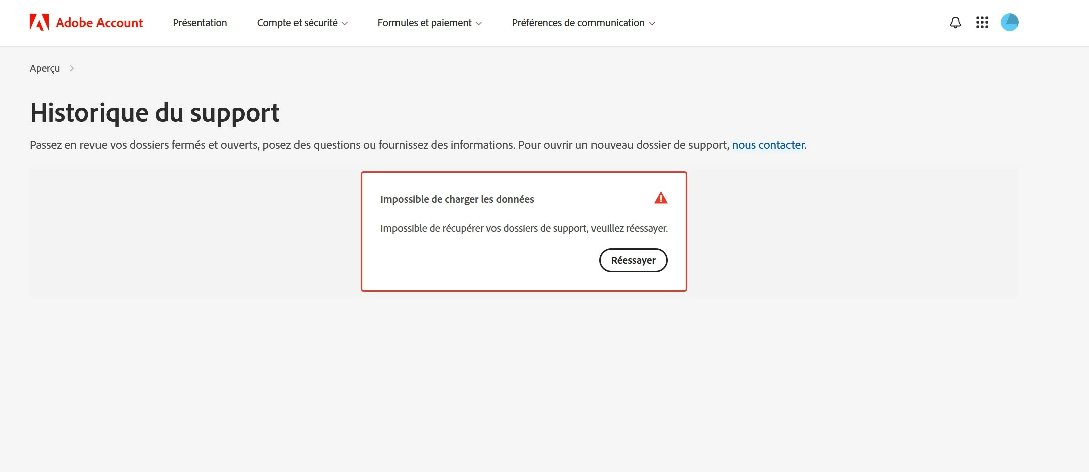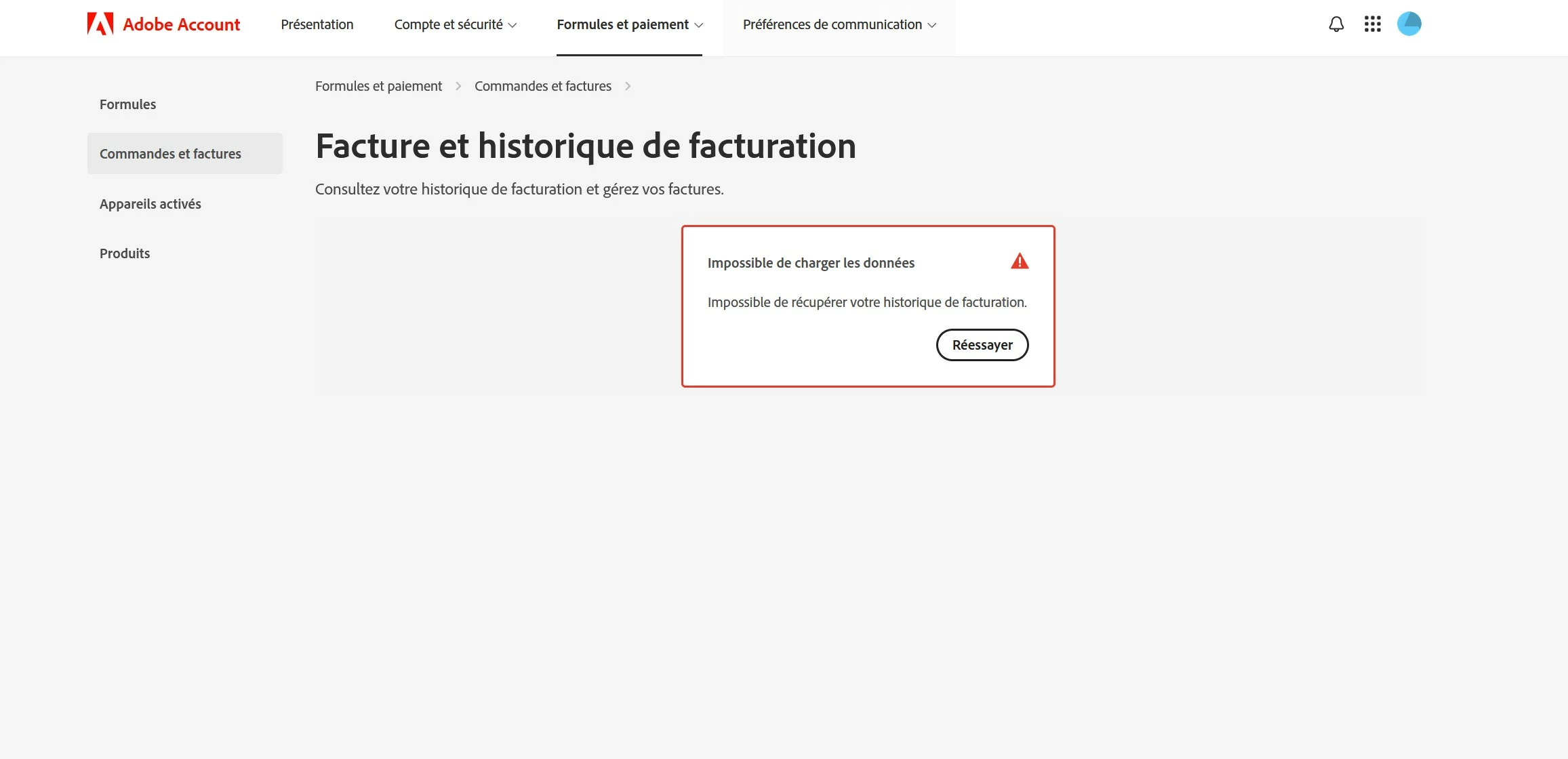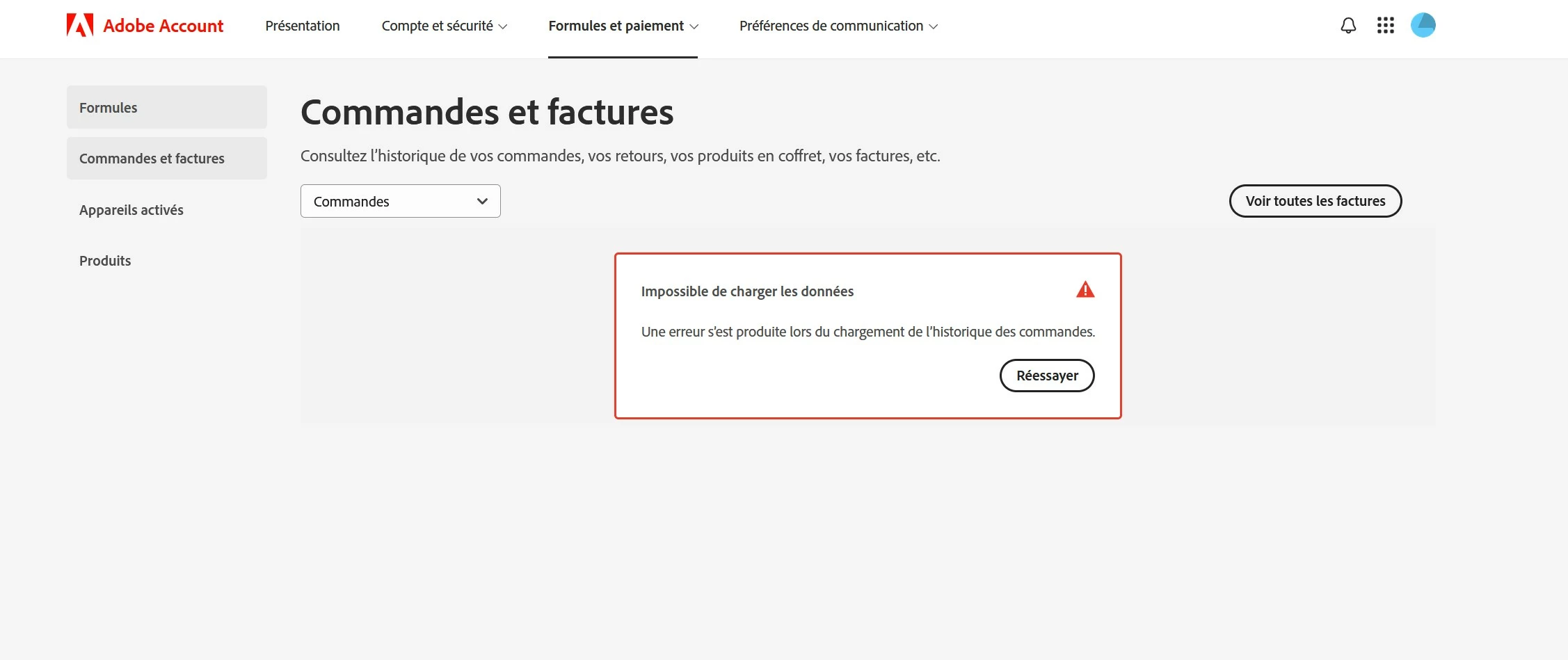 impossible d'accéder à la facture et à tous les onglets / Impossible de charger les données