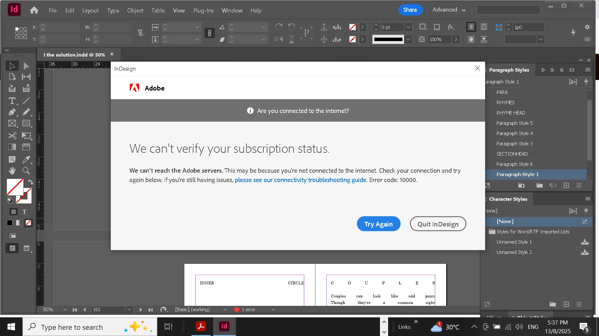 InDesign says 'No purchase found' despite active plan