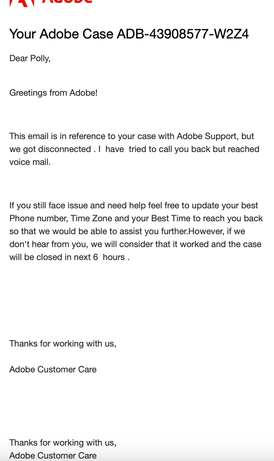 I then got an email from customercare-chatsupport@adobe.com with the below email. The email obviously appears fake due to the wording/format, but the email address seems legit? And the case number is the same as the one that appears on the Adobe website when I log in.