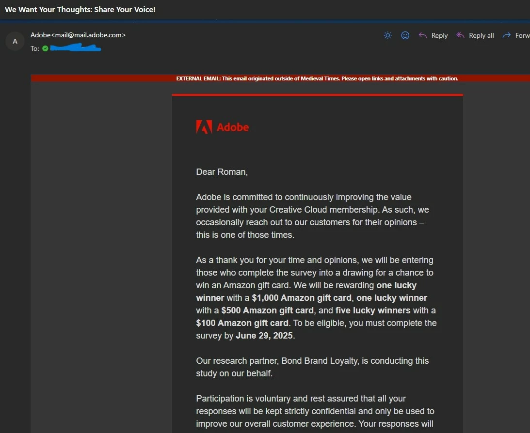 I recieved an email from mail@mail.adobe.com today on my business email. My company does have Adobe creative cloud and I do get a fair amount of emails from Adobe. The one I recieved today offered a chance to win a $1000, $500, or $100 gift card for participating in a survey, run by Bond Brand Loyalty. The email looked legit and the survey did as well. At the end it even asked if I'd be interested in the Adobe Advisory Committee, saying that I could get paid up to $125 for participating in a virtual meeting to discuss the community further. The only personal information I entered was my age, name and email address. Was this legitimately sent and run by Adobe? If not, am I screwed?