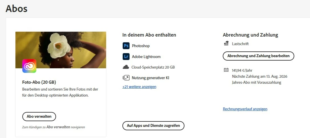 Laut Konto ist mein Foto Abo bis Aug 2026 gültig; LRc oder PS sagen "abgelaufen"
