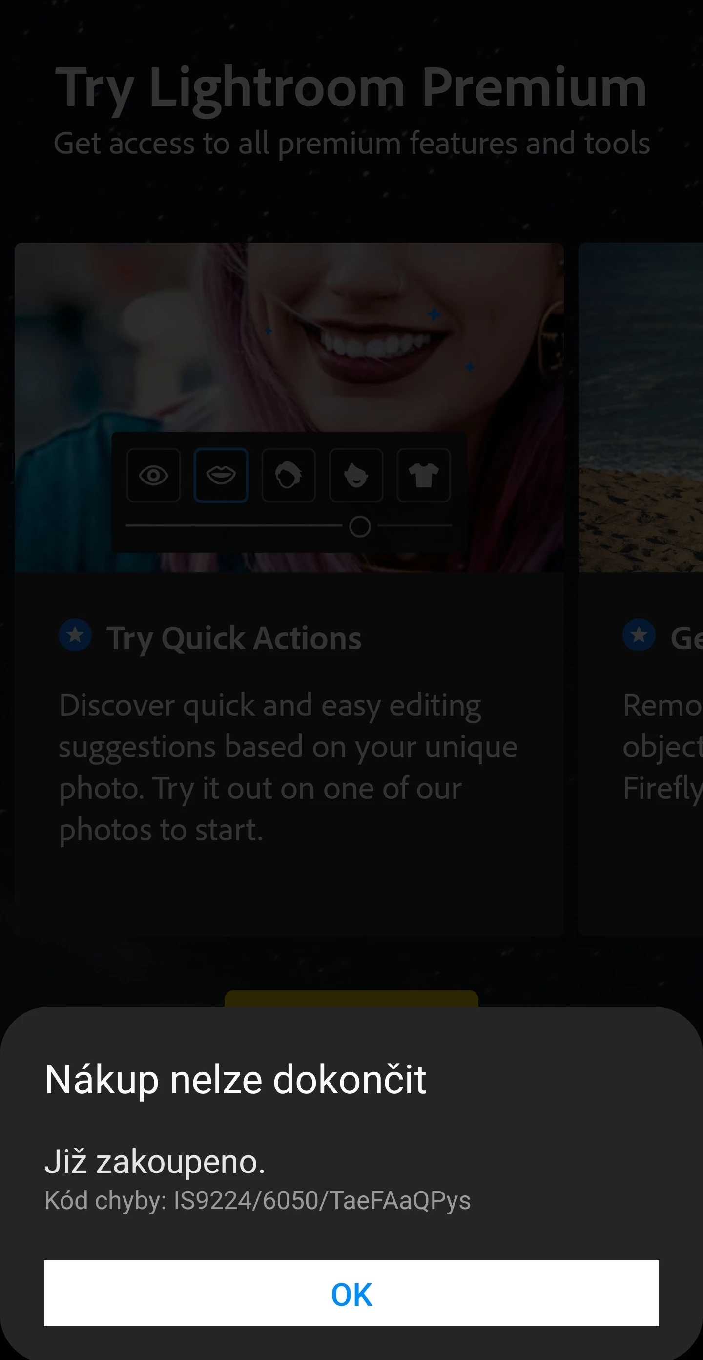 Hello, I wanted to try lightroom premium for samsung but an error (already bought) came up. (Attached image) I've tried reinstalling and clearing cache too. Not sure what to do now