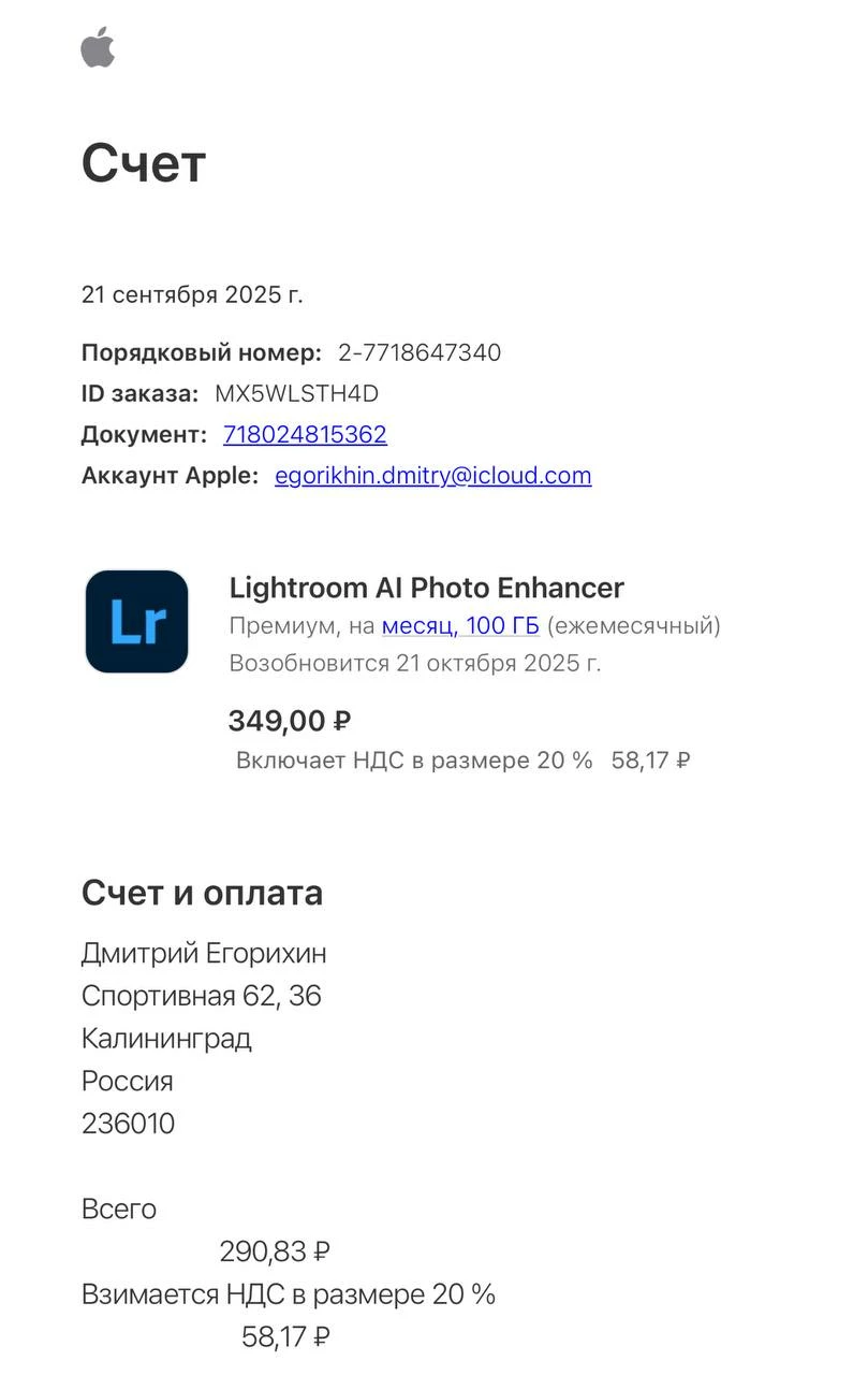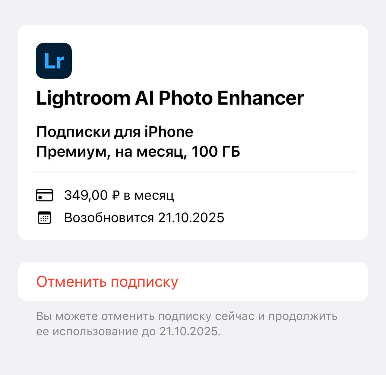 Hello, yesterday 21.09.2025 i have purchased the subscription for Lightroom Mobile Premium via apple account in Appstore. It was working fine in the evening and today untill luchtime, then it suddenly stopped working. Premium functions are disabled. Restore purchases does not help, it says did not found subscription. Same account. In Appstore the subscription ia active. Could you assist how to fix that?