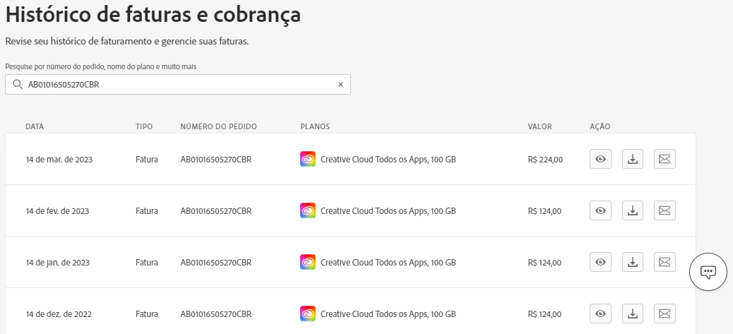 Minha assinatura do Adobe Cloud é a assinatura anual e cobrado R$124/mensalmente todo dia 14.