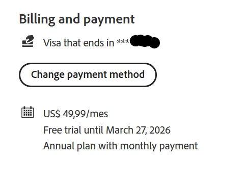For any other unneeded or duplicate subscriptions that you have started, @marianaacalvo see https://helpx.adobe.com/account/individual/subscriptions-and-plans/renewals-and-cancellations/cancel-adobe-subscription.html for steps you can take to self-cancel the subscription. Additional information on the cancellation and the fees associated can be found at https://helpx.adobe.com/account/individual/terms-policies-and-regulations/adobe-subscription-terms.html.