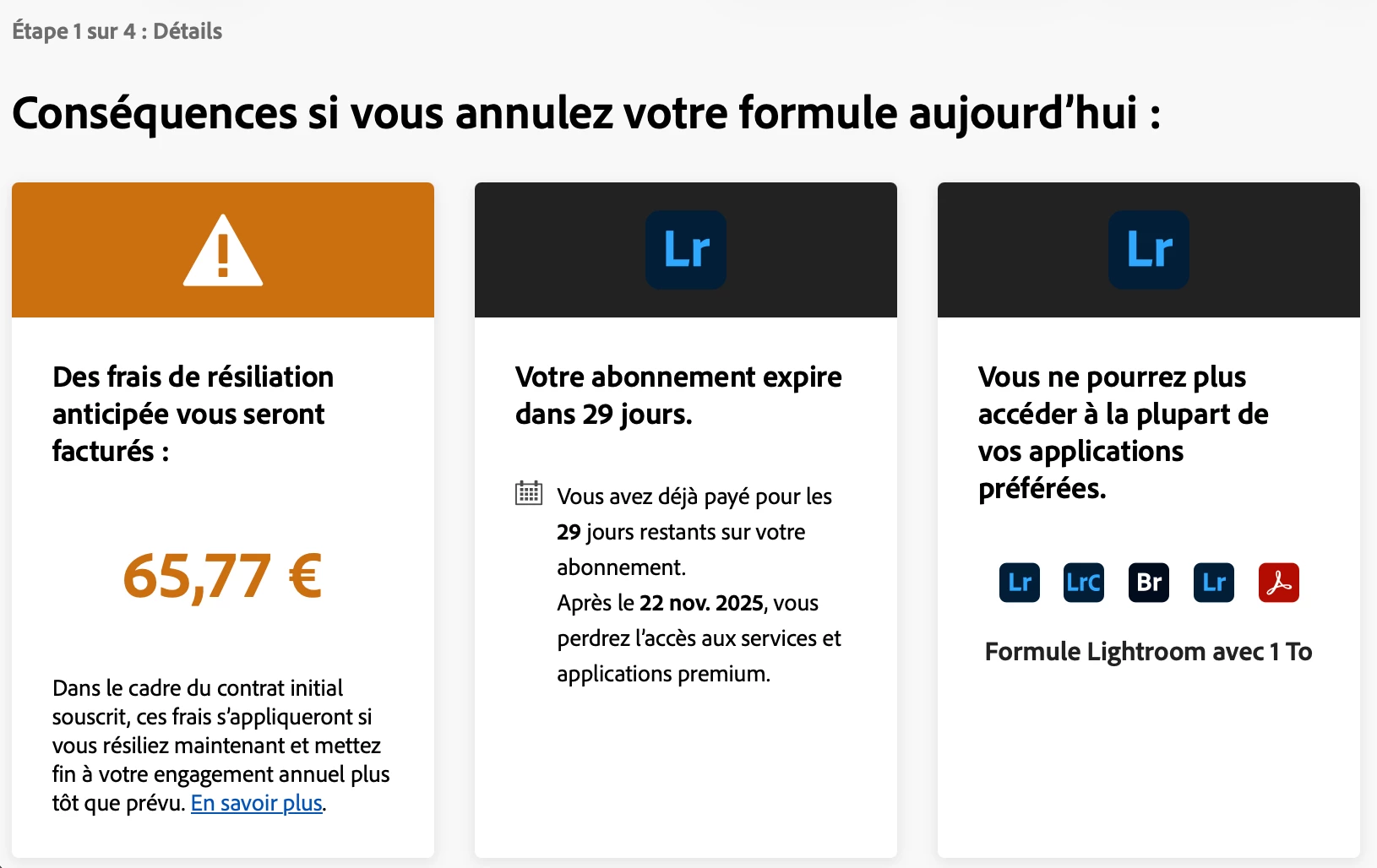 lorsque j'ai souscrit à un abonnement Adobe Lightroom Classic pour 1 mois, je ne me souviens pas m'être engagé sur 1 an.