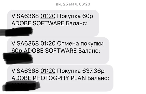 I have some problems paying for services using the Photoshop program. Of my card was debited on may 25, 2020 and July 5, 2020. Two different amounts were debited. Photo attached.