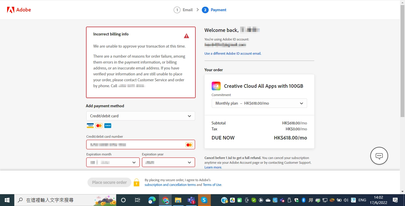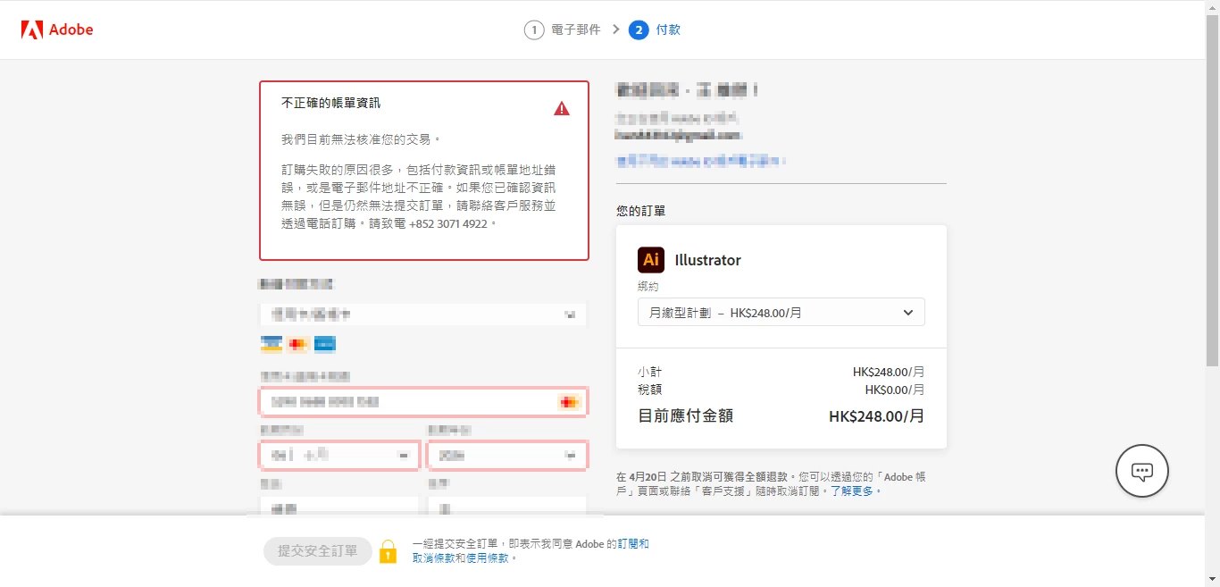 I first entered the correct credit card number, expiry date and name in the payment page, then pressed "Place secure order", and finally the system showed "Incorrect Billing Information".