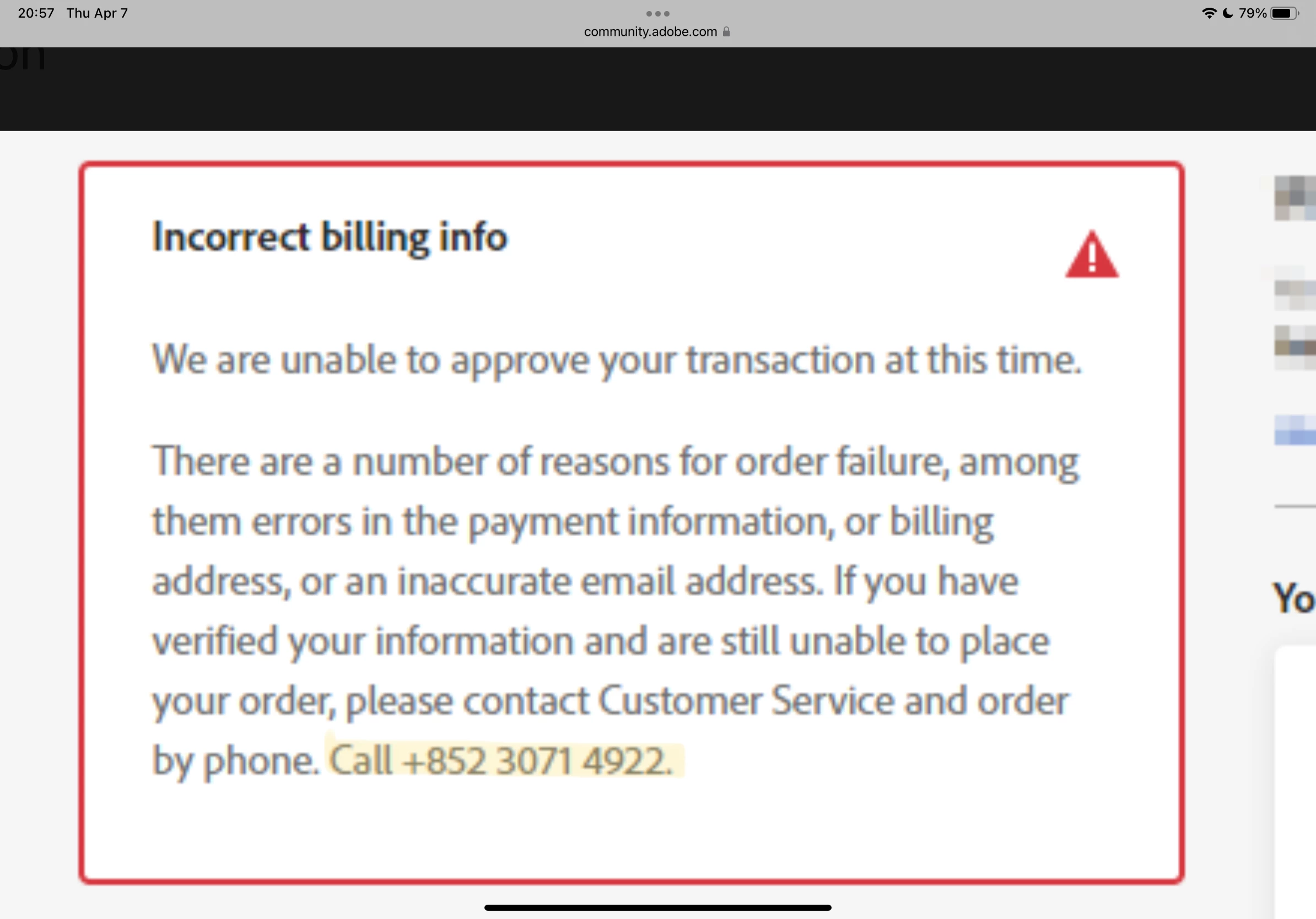I don't understand what's written on the screenshot, however, payment and account issues can be resolved only by the support team. So get in touch with them and they will help you out. To contact support, login to your account and navigate to the URL below. Make sure that the browser has cookies enabled, and all script blockers are disabled. https://helpx.adobe.com/contact.html?rghtup=autoOpen Type AGENT to avoid bots and talk to a human. Also, be mindful of answering anyone who sends you a private message. See the following for more information about scammers https://tinyurl.com/y7cfrr7y -Manan