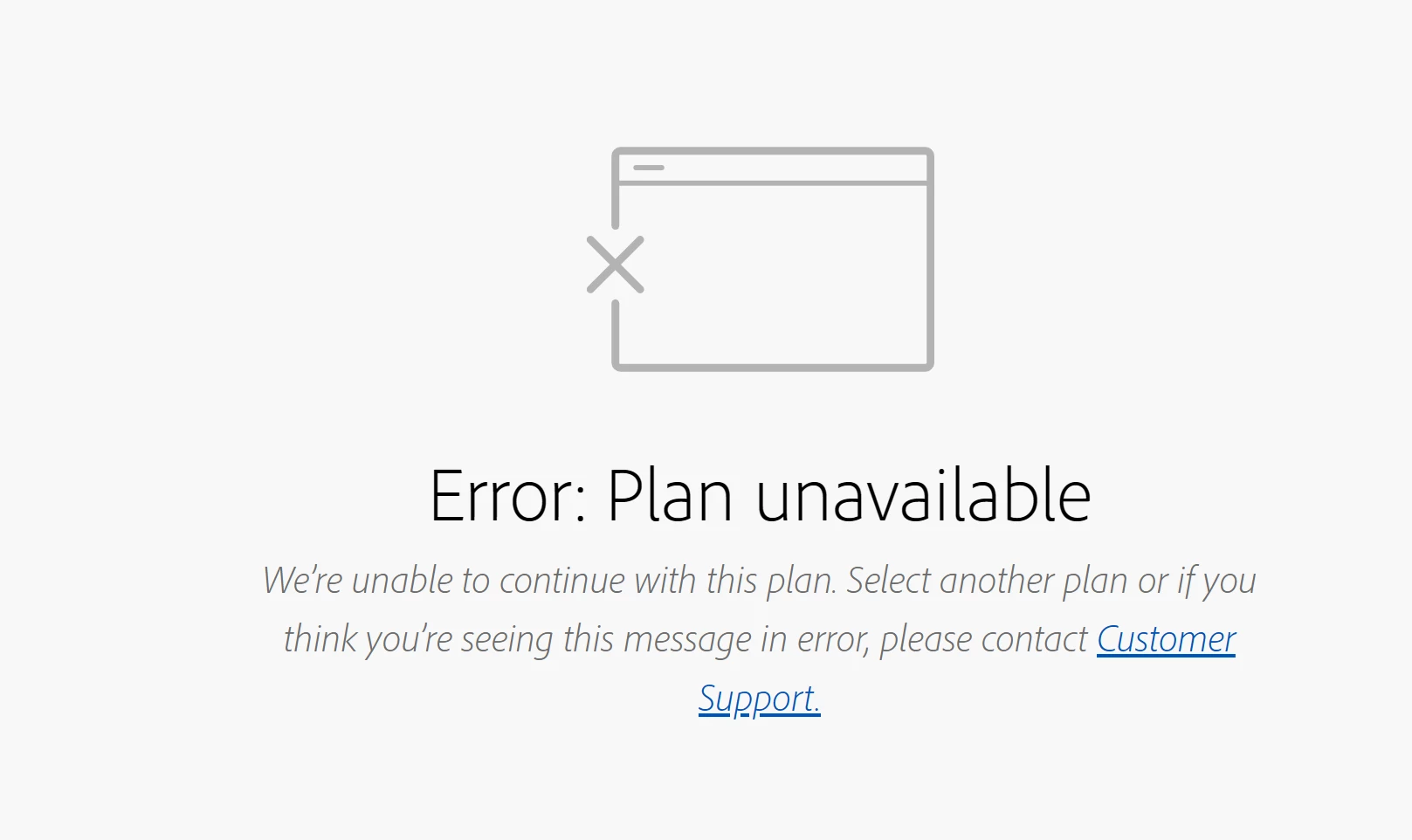 We’re unable to continue with this plan. Select another plan or if you think you’re seeing this message in error, please contact Customer Support."