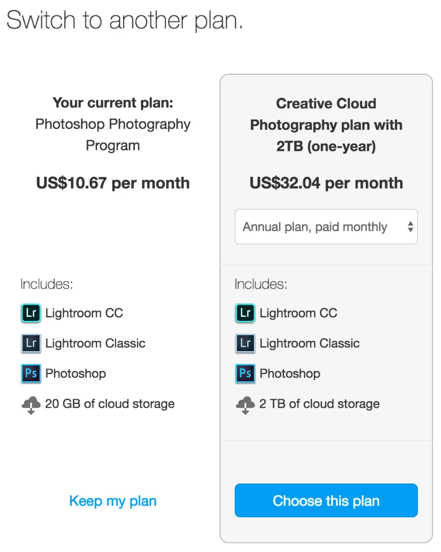 I'm also on the $9.99 Photography plan and follow the links to "Save up to 25% when you upgrade to the Creative Cloud Photography plan with 1TB of cloud storage US$14.99 /month" and that plan is not listed.