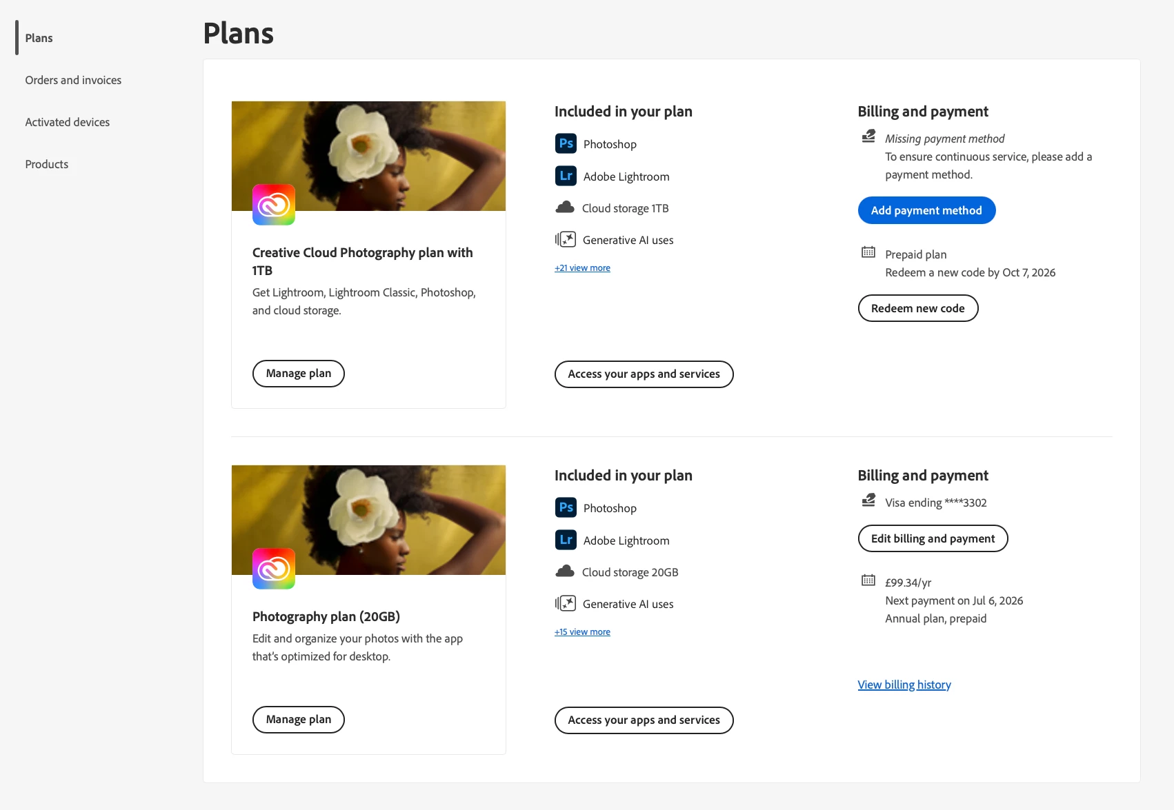 Purchased Adobe Photography Plan 1TB expecting it to be added to my current subscription