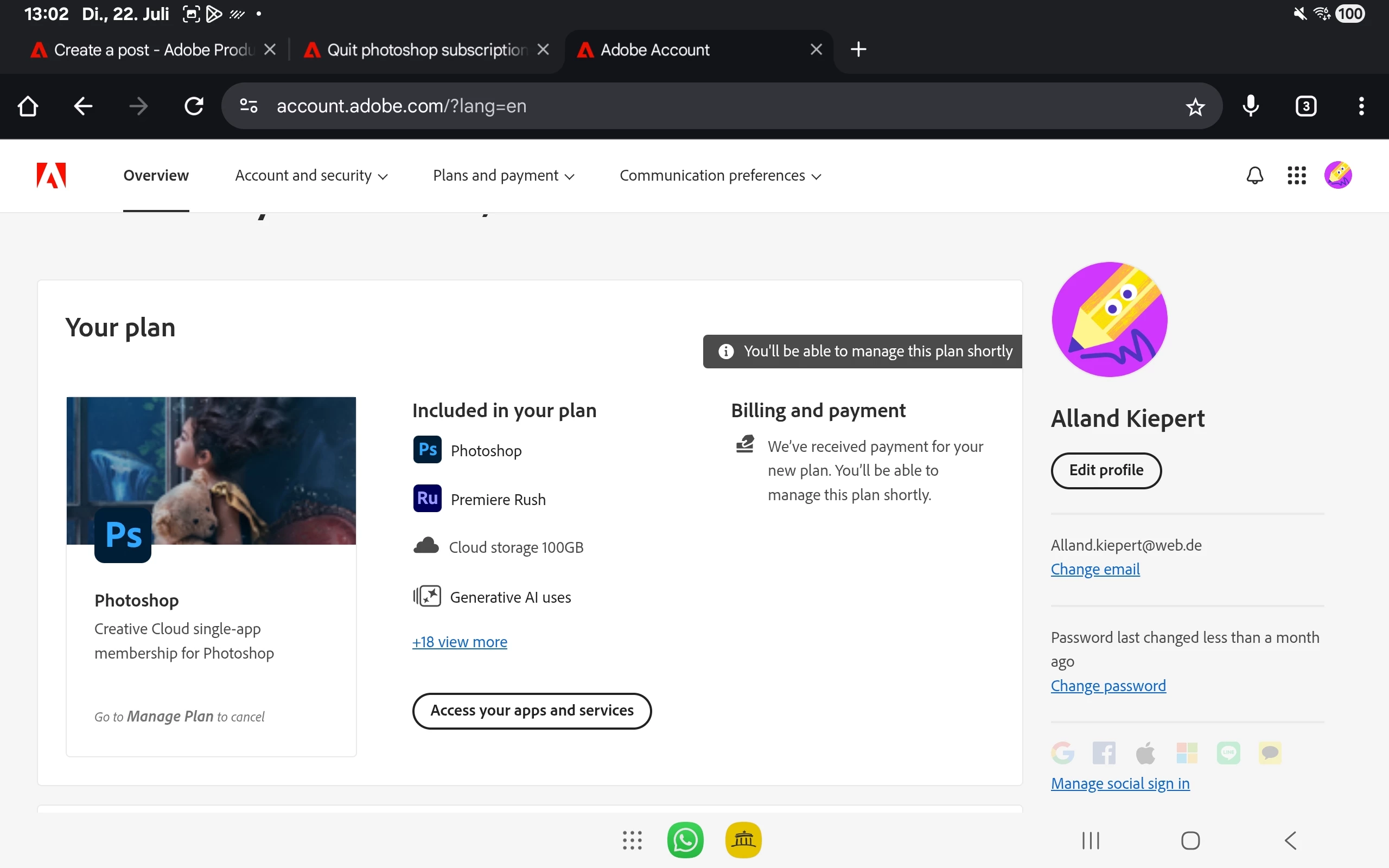 Hey. I tried out the 7 days free photoshop. But now i cant quit it. Since two days it says that "die Verwaltung dieses Abos wird in Kürze möglich sein " meaning "managing this subscription will be available soon". Has somebody had a similar experience ? Tried to find a contact email or telephone number but couldnt find any....