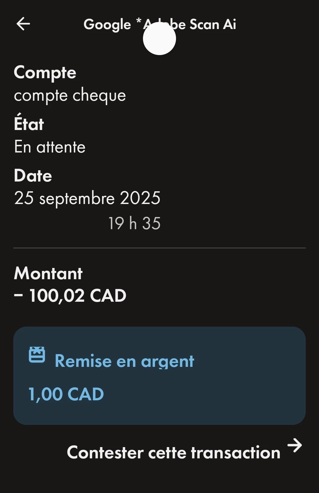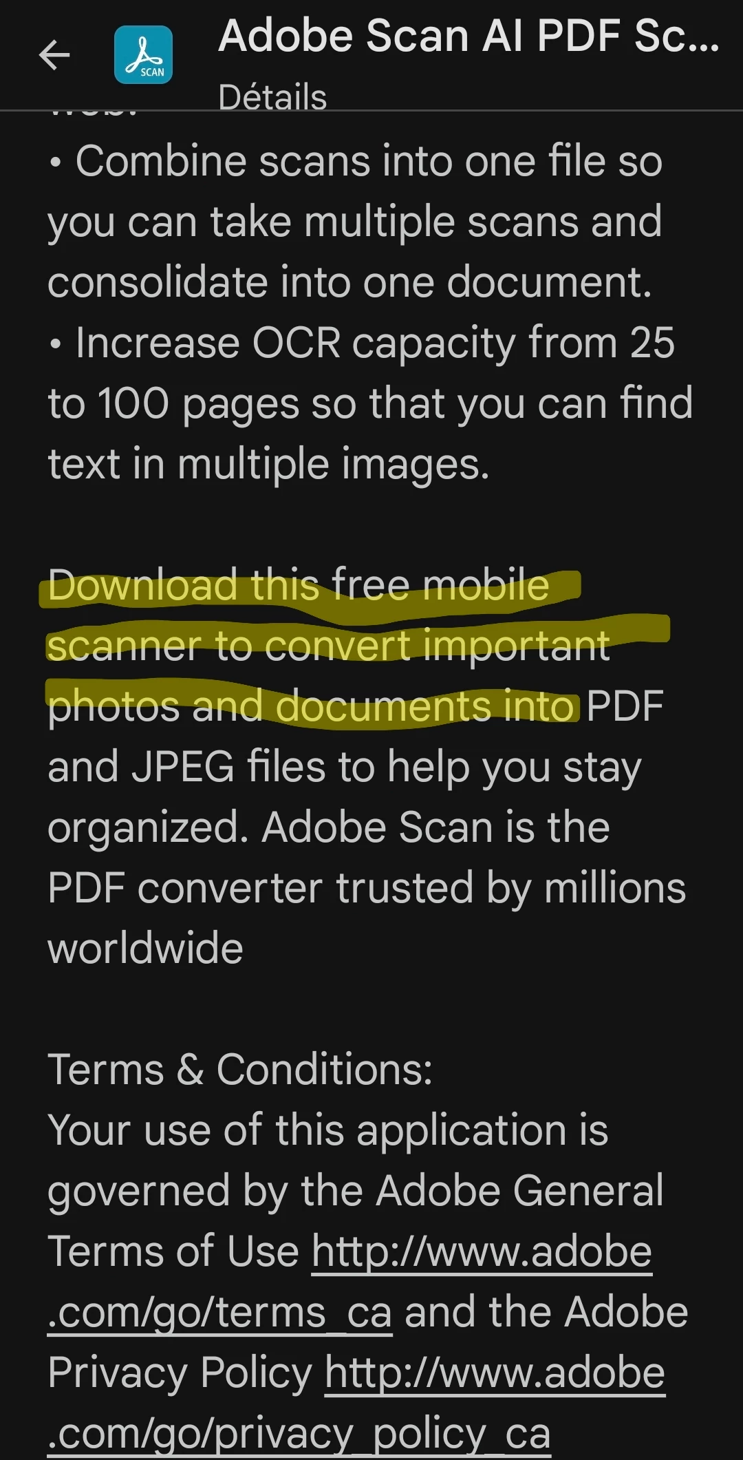 Bonjour, vous m'avez offert un essai gratuit de Adobe scan dont j'ai essayé et que je suis insatisfaite avec mon travail puisque ce n'est pas ce que je recherche par contre vous mentionnez de télécharger l'application gratuitement mais vous exigez de mettre un mode de paiement alors que c'est gratuit et aujourd'hui vous vous permettez de prendre un abonnement annuel de 100 $ dans mon compte sans même m'aviser ni un courriel ni un rappel RIEN NADA!!!!