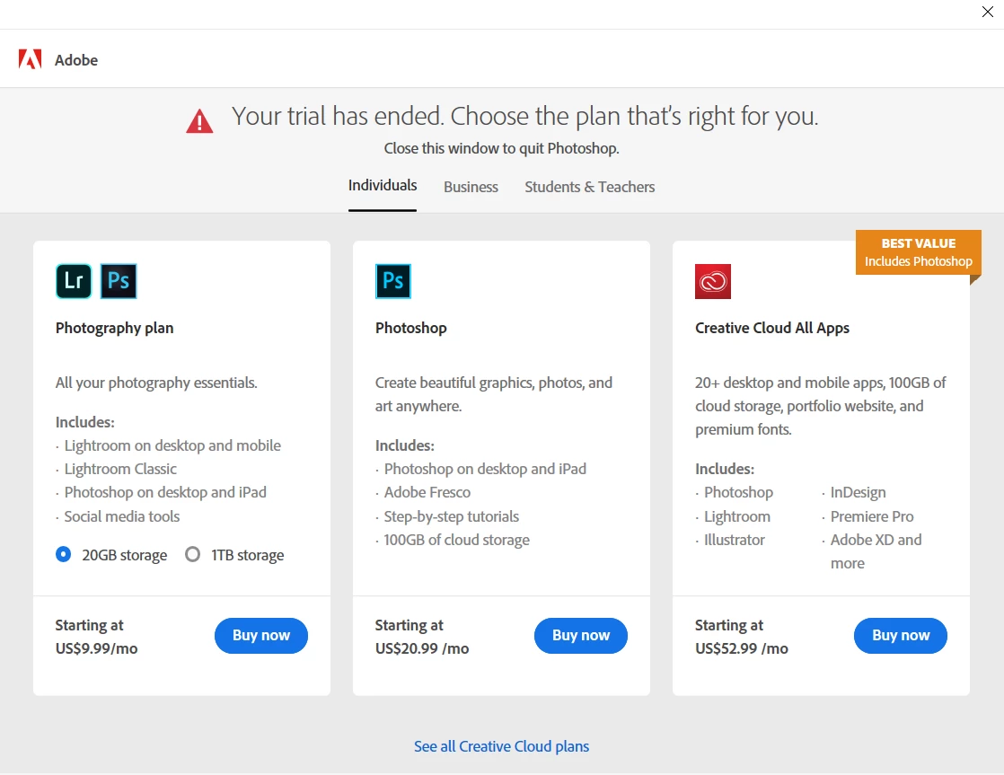 If I am on the Web Creative Cloud Home page, it does say Photoshop is included in my plan, but no where else. I need to complete an assigment very soon and this is preventing me.