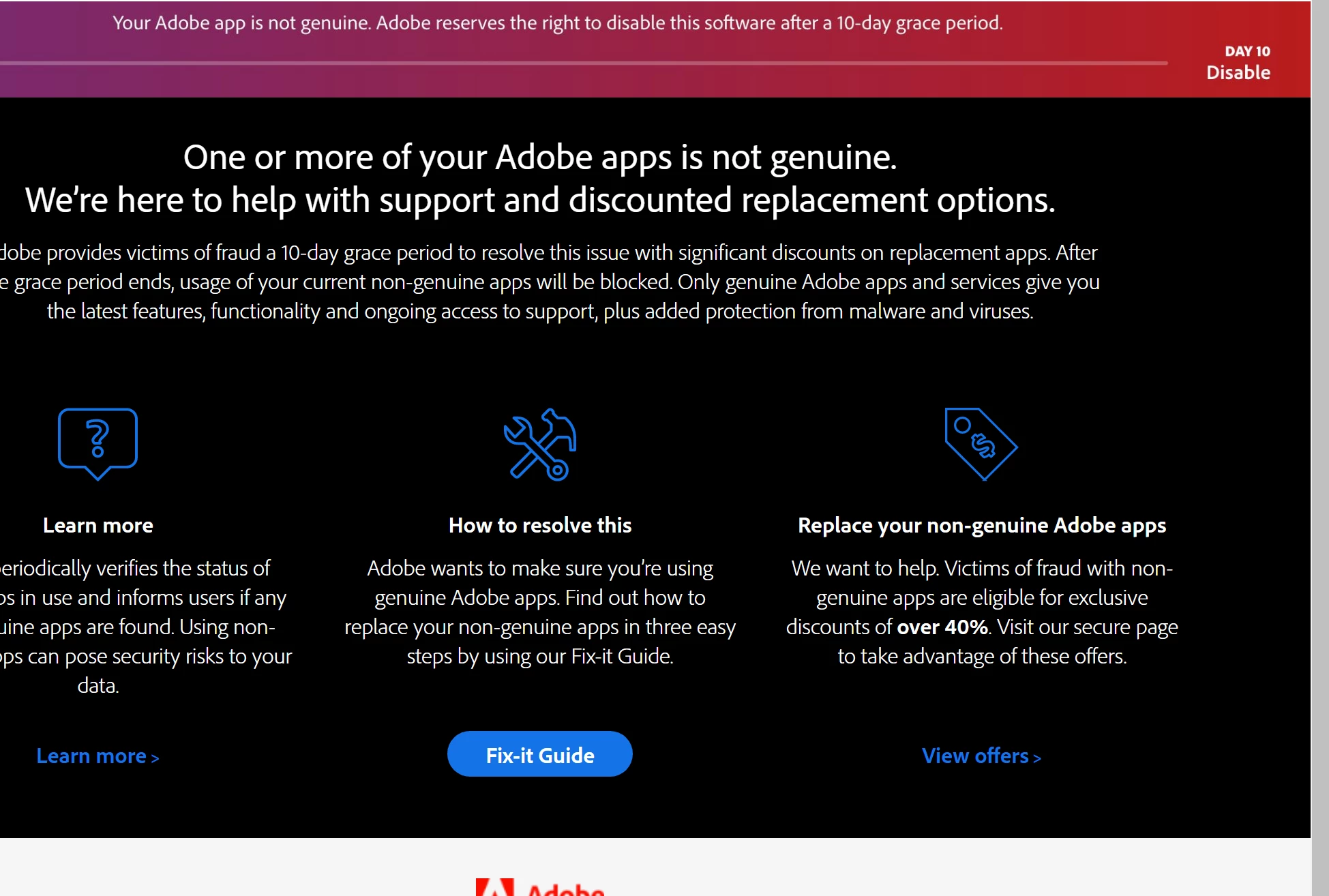 Hello I’ve been receiving pop ups saying one of my Adobe apps on my surface pro is not genuine and will be removed in 10 days. However all of the Adobe apps I have were purchased by my school correctly and I’ve had them for many years So it makes no sense to notify me now 4 years later and despite them being real