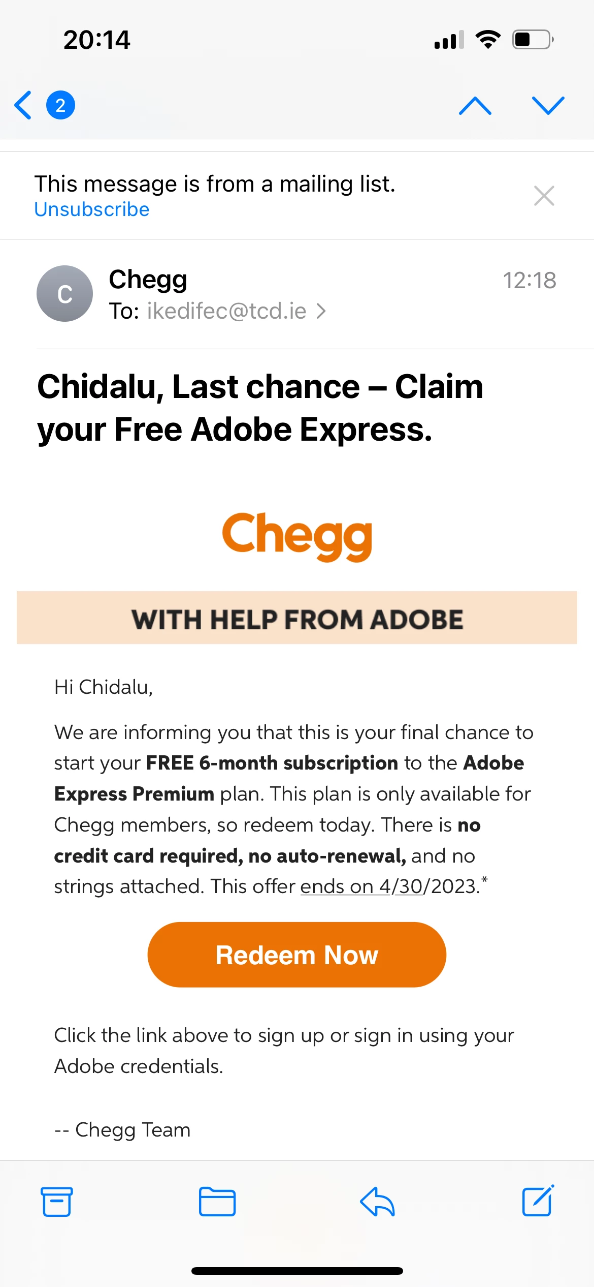 DDiet29585983h2poParticipantForum|Forum|2 years agoApril 25, 2023QuestionRedeem your Creative Cloud Express MembershipForum|Forum|2 years agoApril 25, 20232 replies501 viewsI received an email that I am entitled to the free 6month subscription on adobe express through my Chegg subscription. I followed all the steps through to downloading the app, yet my account isn't the 'express' version. Pls help?Problem or errorSubscription