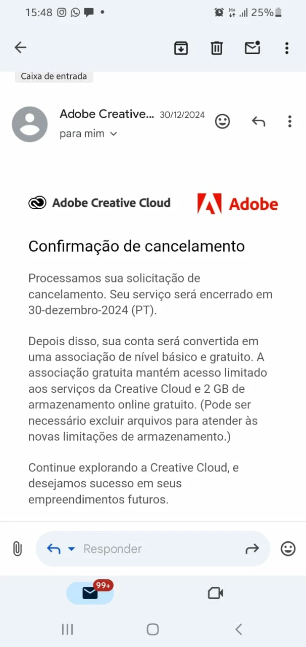 Contratei o plano dia 30/12 porem no mesmo dia solicitei o cancelamento e me foi concedido, porem esta sendo descontado todo mes o valor de 139,00 desde janeiro/2025, sendo que, o cancelamento nos primeiros 7 dias eram sem cobrança alguma. o mesmo tal plano" incluia o Lightroom, porem tenho o app, e nunca foi me disponinilizado nenhum dos serviços incluidos no tal plano, o que, comprova que nem se quer esteve disponivel pra mim usufruir de quaisquer serviço, desejo o cancelamento da assitura sem qualquer valor a ser cobrado e também o reembolso dos 5 meses cobrado, segue em anexo os compovantes do cancelamento.