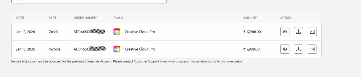 I purchased the Adobe Creative Cloud plan on 13th Jan, 2026 with invoice number 3335834474 and purchase order number AD04651202742CIN and got charged 17988 INR.