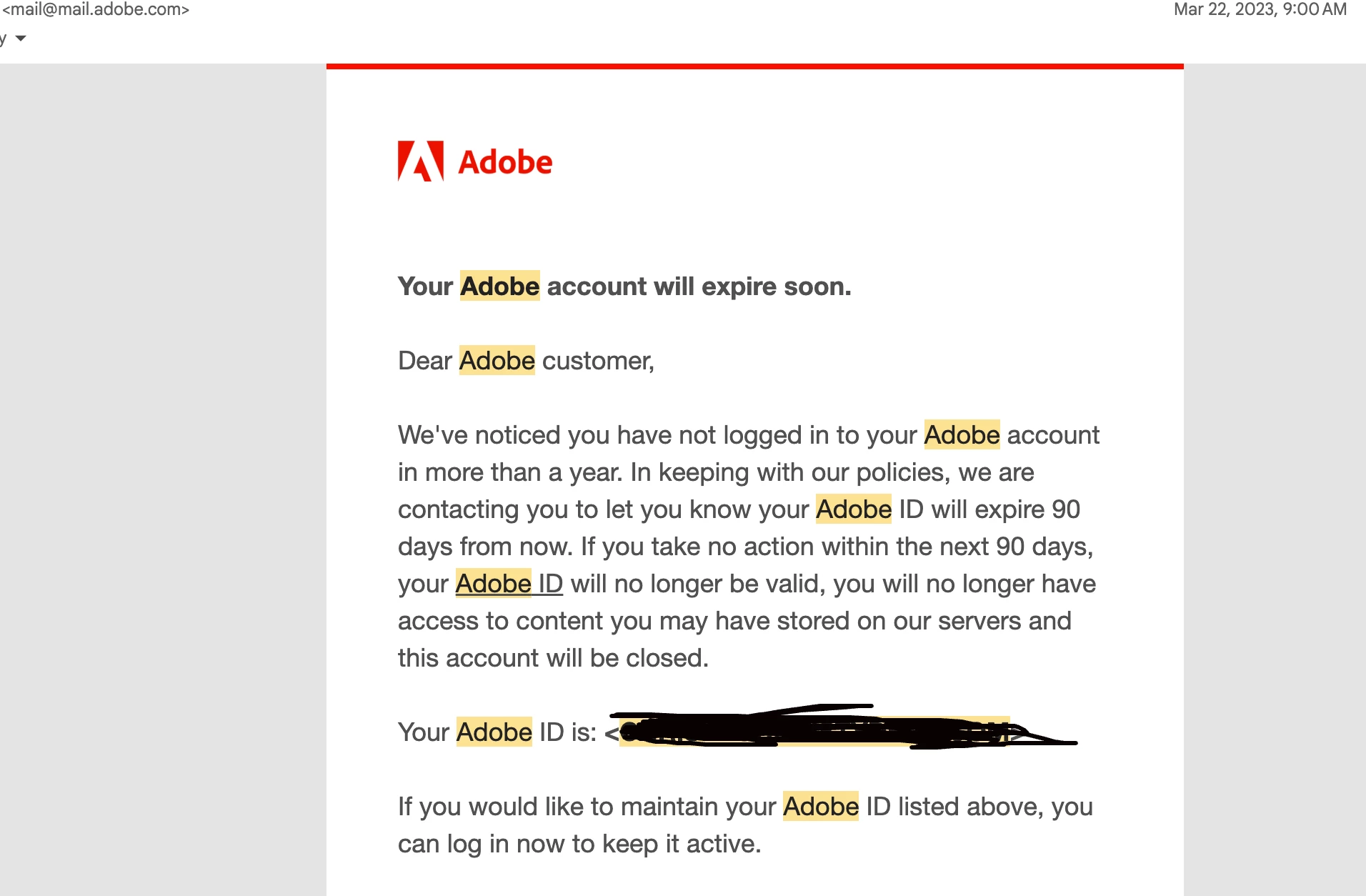 This was a notice I got back in 2023. Is it possible I've been paying for years for an account I don't use? Whenever I log into Adobe, it defaults to my current account, so I cannot check.