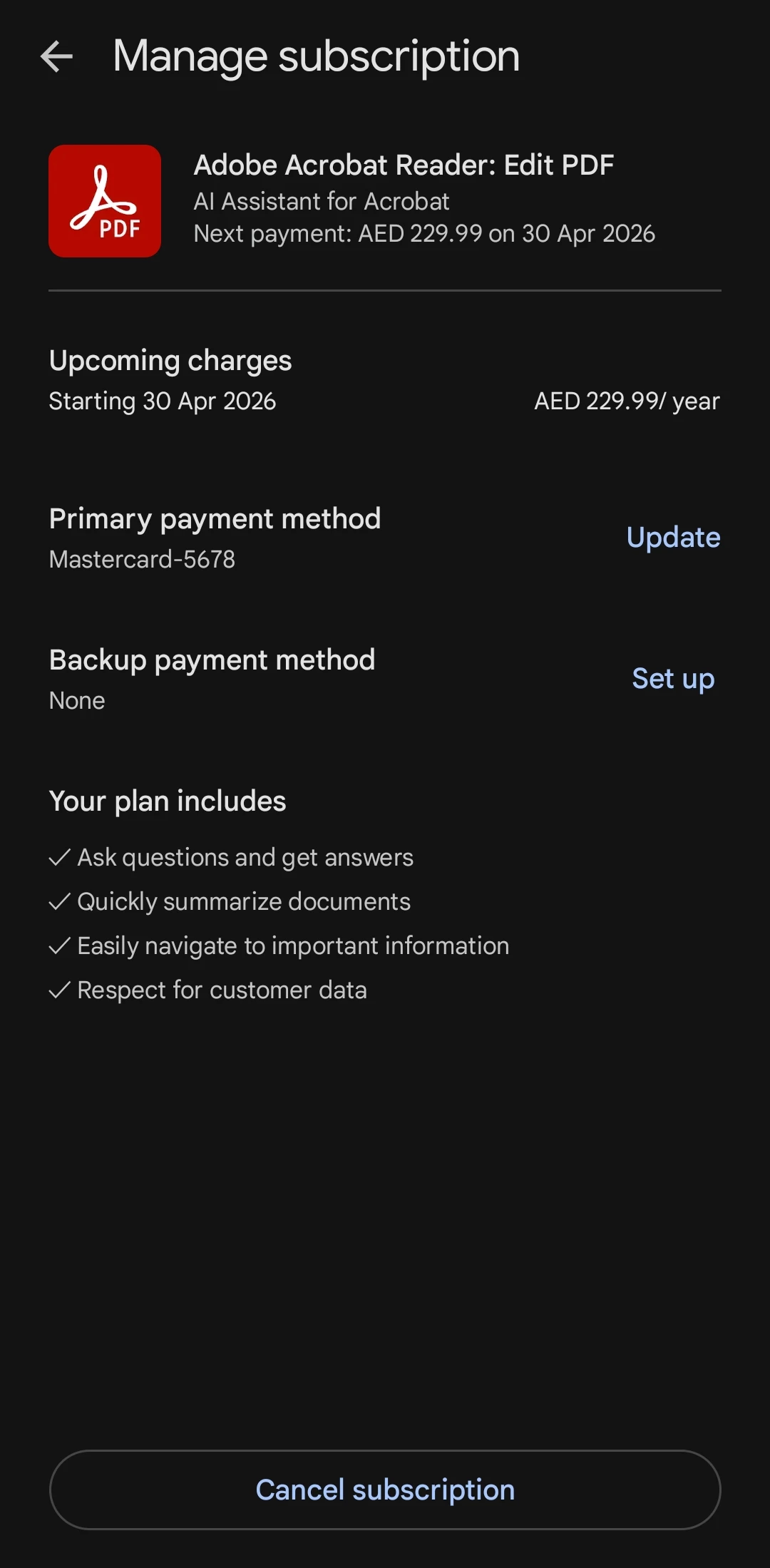 I am writing to inform you that I have mistakenly subscribed to an annual Acrobat subscription, which has charged me an amount ofAEDD 229. Immediately after realizing the error, Iunsubscribedd from the service.