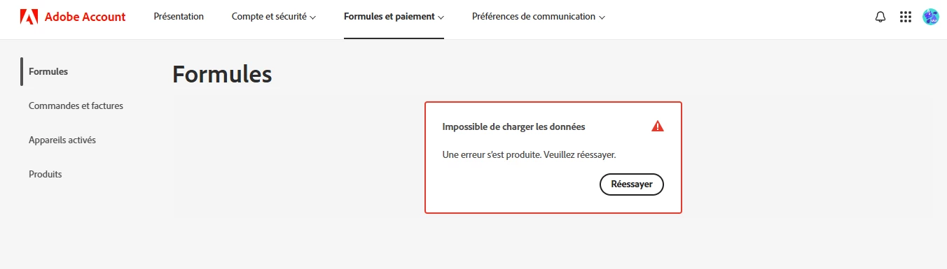 Bonjour, depuis une semaine, je n’ai plus accès à mon espace personnel, notamment à mes formules d’abonnement. Or, je souhaite résilier une période d’essai Adobe Stock avant le 15 août. Un message d’erreur s’affiche systématiquement, ce qui rend la démarche impossible et soulève des interrogations. Je vous remercie de bien vouloir m’indiquer la marche à suivre afin de régulariser la situation.