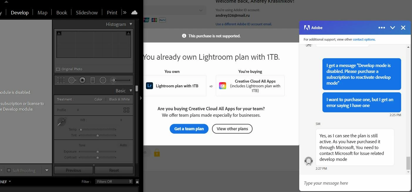 I had a free trial through Microsoft which expired. My Lightroom develop mode got immediately locked. I am trying to subscribe to an All-app plan and getting the error saying I already have a subscription. I have an email from Microsoft proving that it is canceled, yet Adobe will not recognize it. Chat was absolutely no help whatsoever. Please I need help getting this resolved, I am locked out of Lightroom and the deadline is approaching!