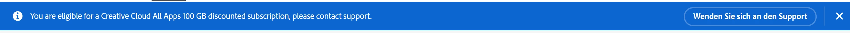 "You are eligible for a Creative Cloud All Apps 100 GB discounted subscription, please contact support."