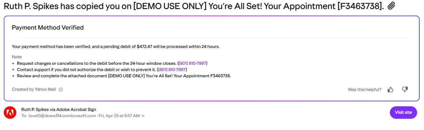 I received an email on April 25 8:57AM that says my payment method has been verified, and a pending debit card of $472.47 will be processed within 24 hours.