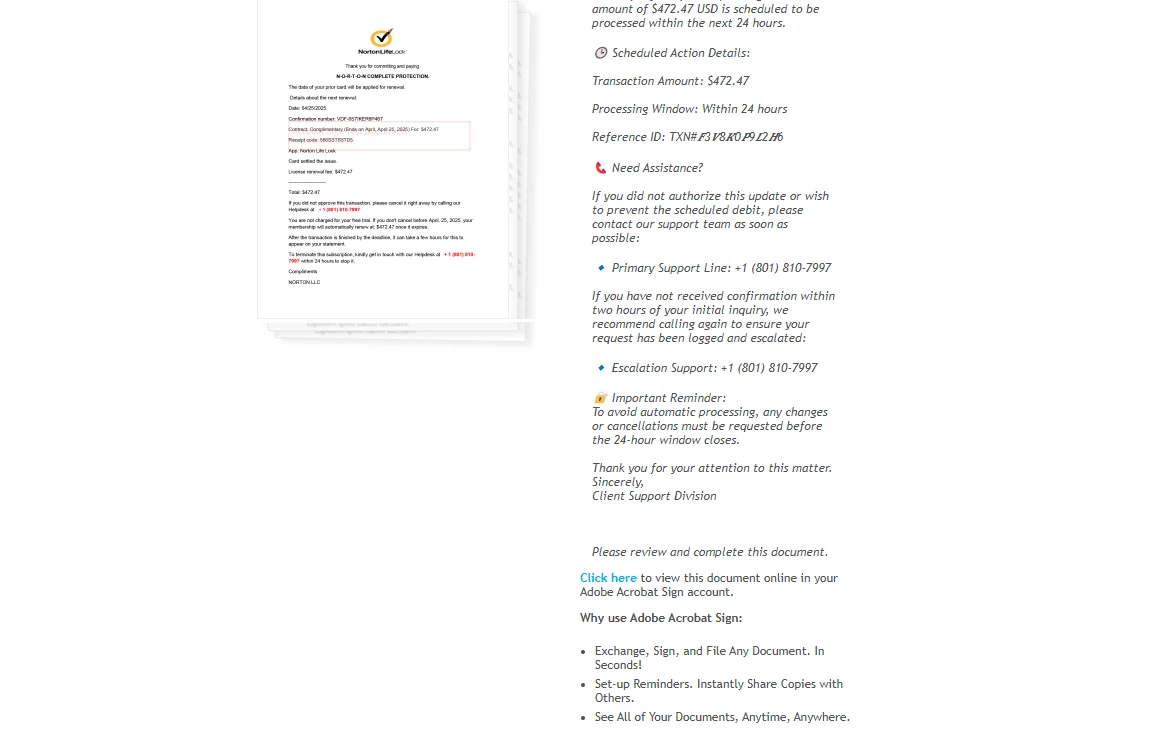 I concluded that this email is scam because I noticed of this email at April 26 past 9PM(24 hours already passed) and I checked my bank account and there's no record of paying $472.47.