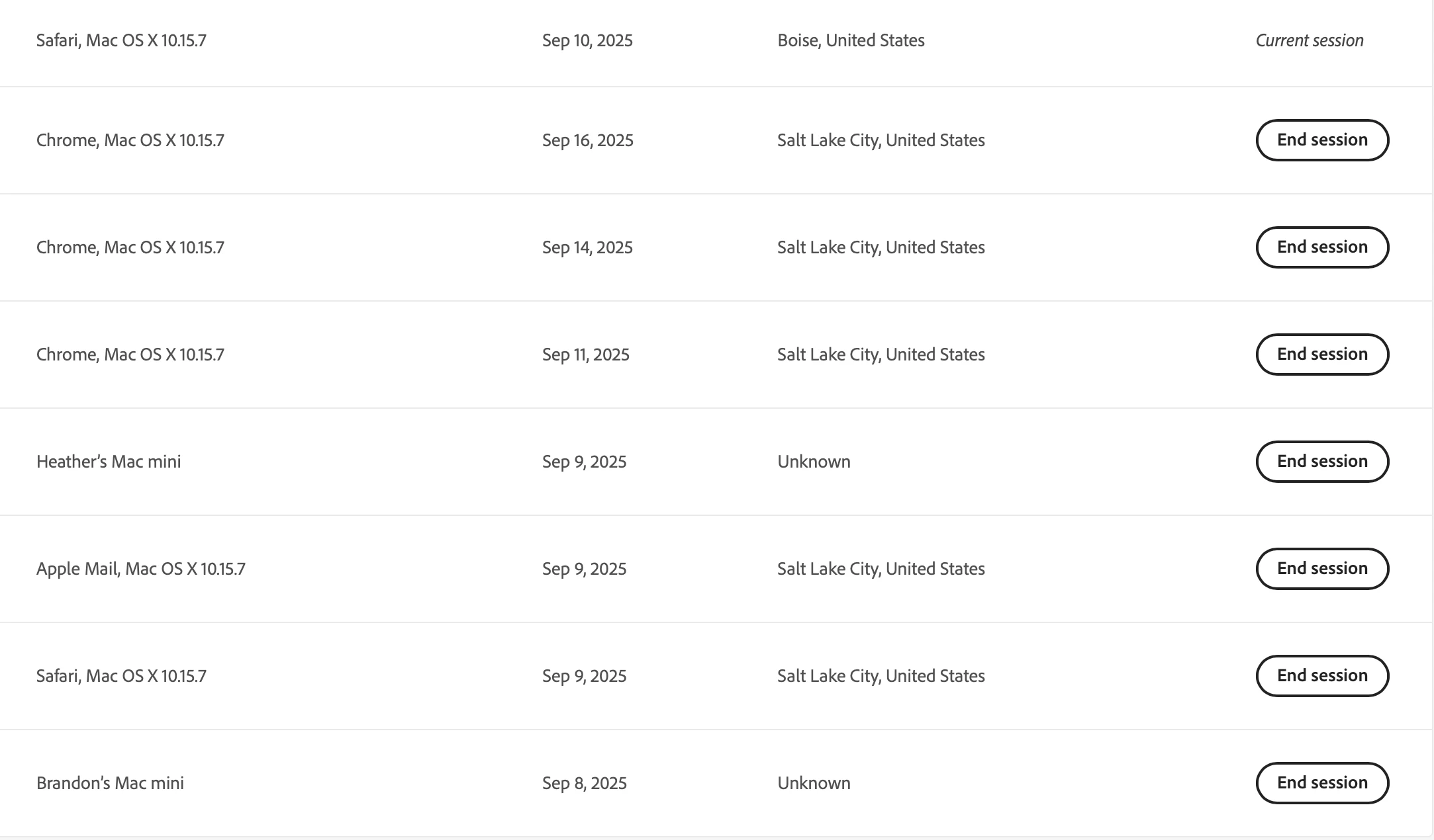 Hello i had replied to an earlier post but it was locked. I am constantly just in the last two weeks or so getting "Theres already too many instances of this program" pop ups when I sign into adobe illustrator and acrobat. Never in photoshop. I only use the same two machines I always have, also I shut down each of the individual computers when I am done but it keeps duplicating the same sign ins and not seeing them as the same. I had followed all the steps instructed online and via adobe to no avail. I keep having to end all sessions and sign back in. Its getting very annoying. Could someone please look into this as it seems I am not the only one having this issue. I am not using different machines, Just two mac minis, one at home and one here. I never sign into these accounts anywhere else and have done so for at least a year. This just started about two weeks ago. It started after I updated adobe the last time.