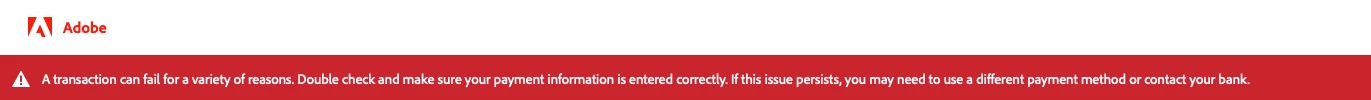 My current payment method is expiring soon so I got a new company debit/credit card to use for Adobe. It's a brand new card, just got it this afternoon, and I'm trying to update my current card or add a new one altogether, and I keep getting this message: