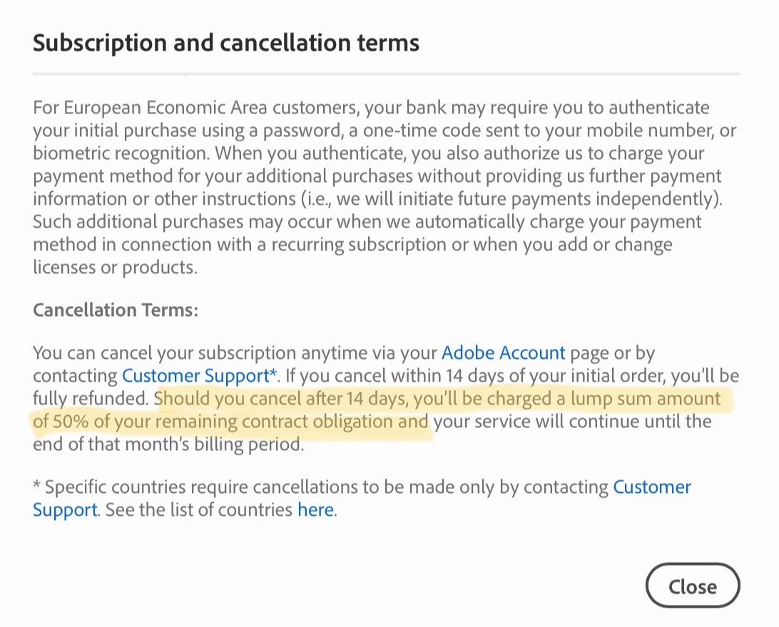 I clicked that link the day I registered for adobe looking specifically for anything that mentioned a cancellation fee. There was NOTHING. Not one word mentioning any form of cancellation fee. There is a section titled "Cancellation Fee and Refund" but says absolutely nothing about a cancellation fee, only talks vaguely about a 14 day refund.