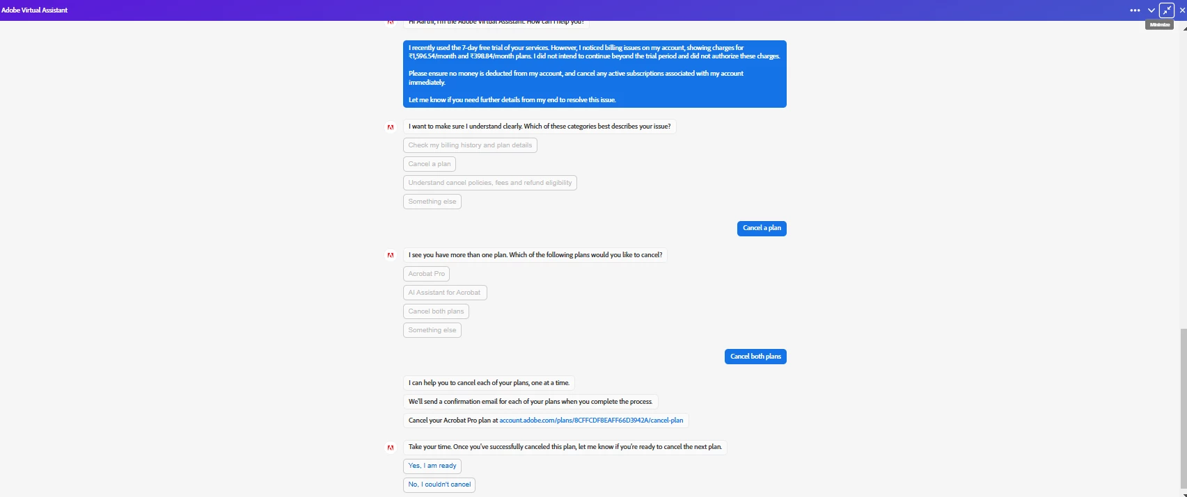 I recently signed up for the 7-day free trial of Adobe Acrobat Pro and provided my card details during the trial. However, I am now seeing billing issues related to ₹1,596.54/month and ₹398.84/month plans, which I did not intend to continue after the free trial.