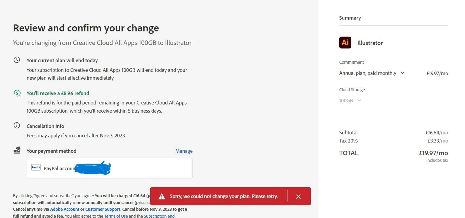 To resolve this I then tried to reduce my costs by 'managing my account' and reducing my 'ALL' package to Illustrator only for my daughter to use now she has started college but it wont allow me to change my package.
