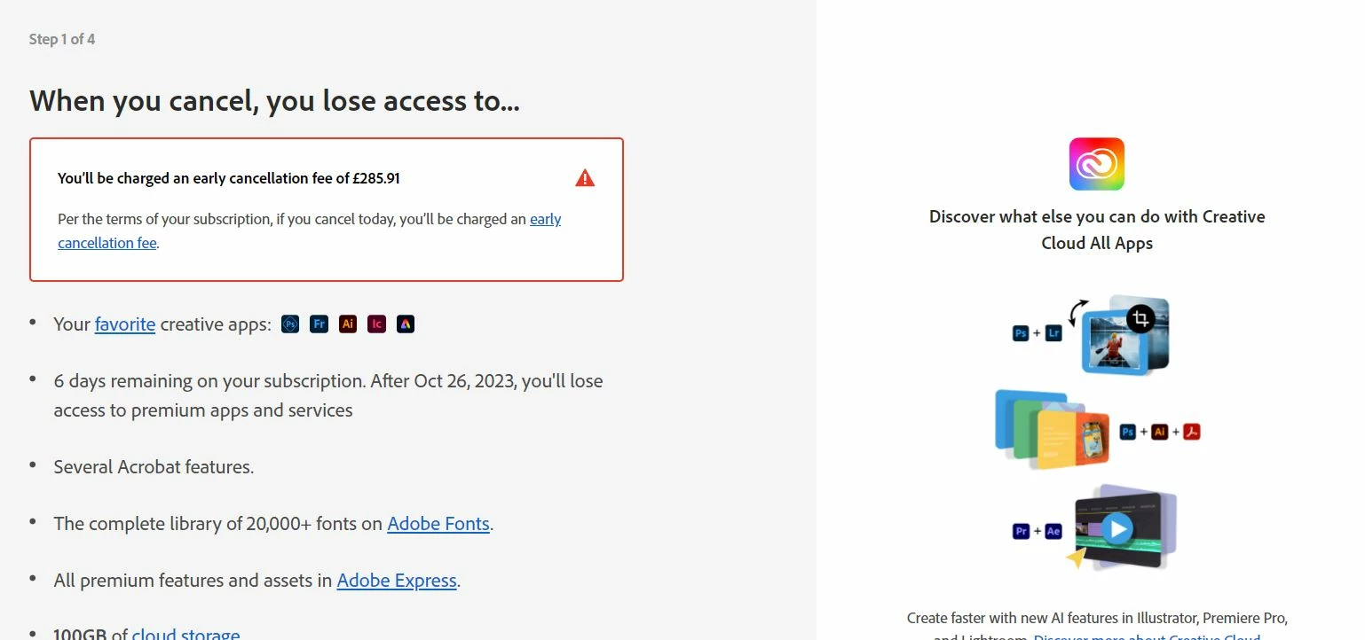 I have had the same package from adobe for several years, I used it all through University, Undergrad and Masters. I now have a separate account for work which I now use most often so instead of paying over £50 a month I tried to cancel my account only to be told there was a £286 cancellation fee- I cant afford to keep the account so I certainly cant afford to pay the cancellation fee.
