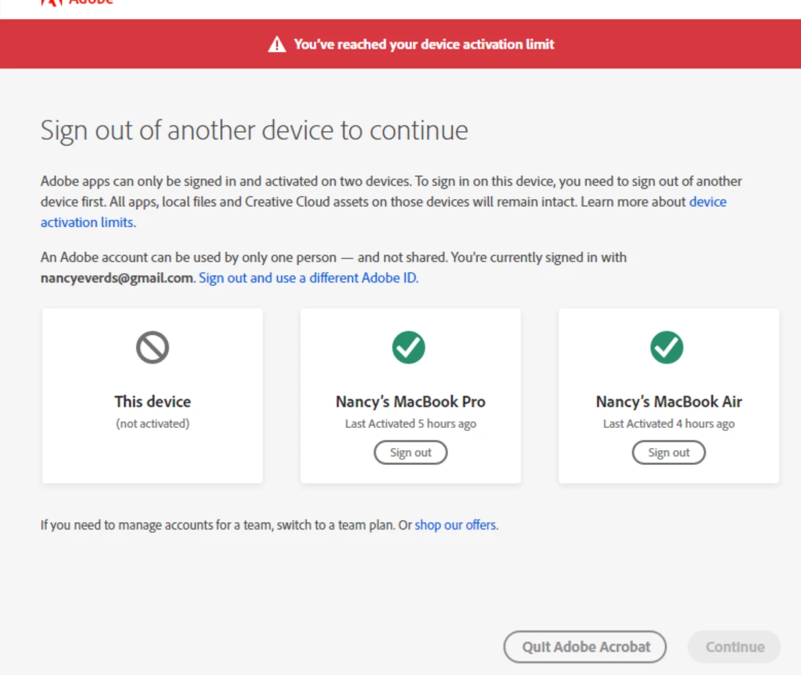 Unable to use free Adobe Reader on 3rd device
