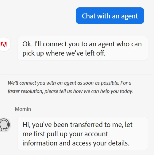 chat: use a browser that allows popups and cookies, and click here, https://helpx.adobe.com/contact.html?rghtup=autoOpen in the chat field (lower right), type AGENT be patient, it can take quite a while to reach a human.