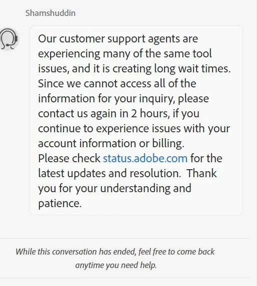 there are 2 ways to contact adobe; chat and twitter: