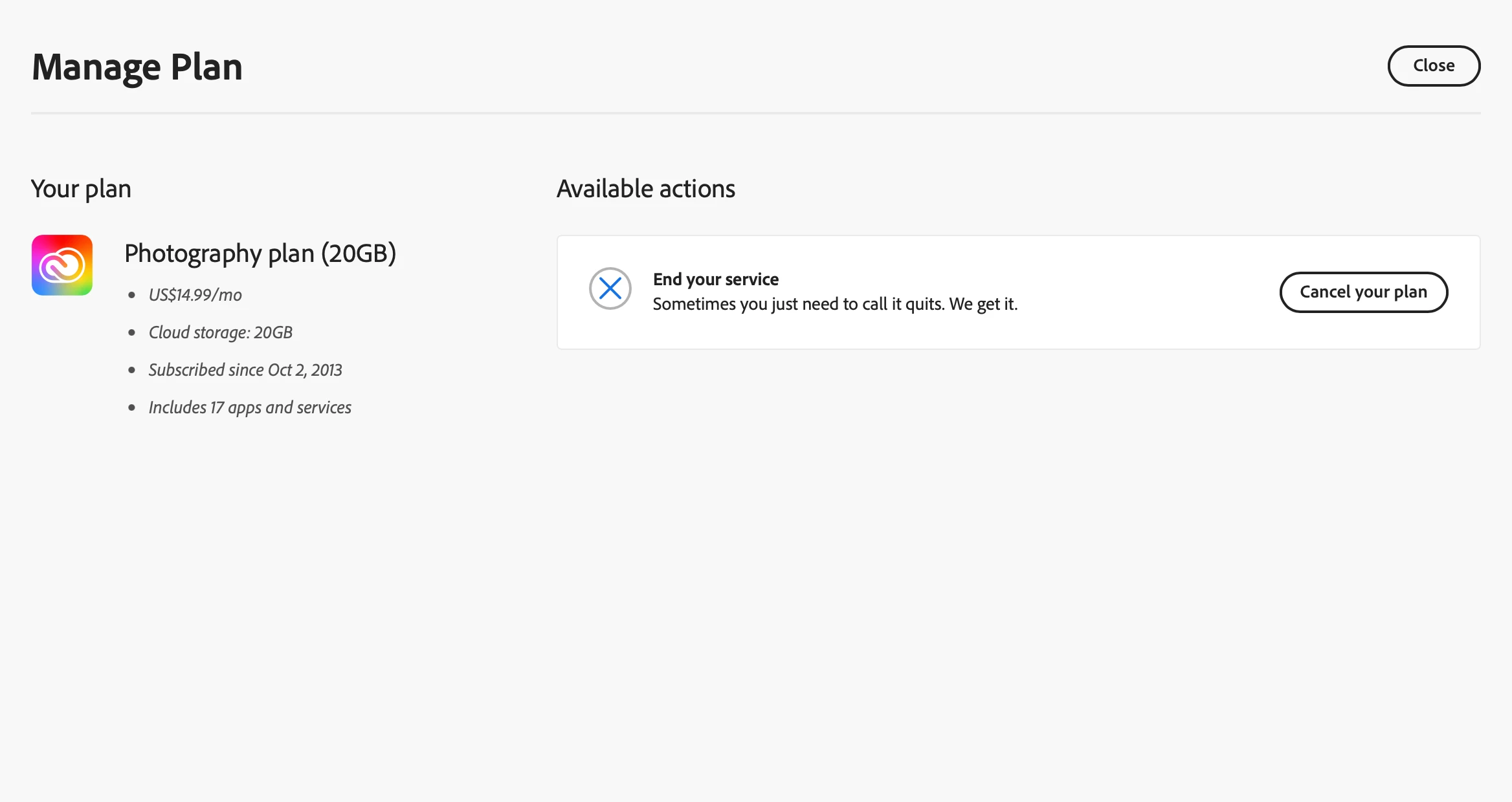 "The price of the Photography plan (20GB) annual, billed monthly plan is changing from US$9.99/month to US$14.99/month (plus applicable taxes) on your next renewal date. To maintain your effective current base rate (excluding any promotions) you can change your subscription to an annual, prepaid plan.