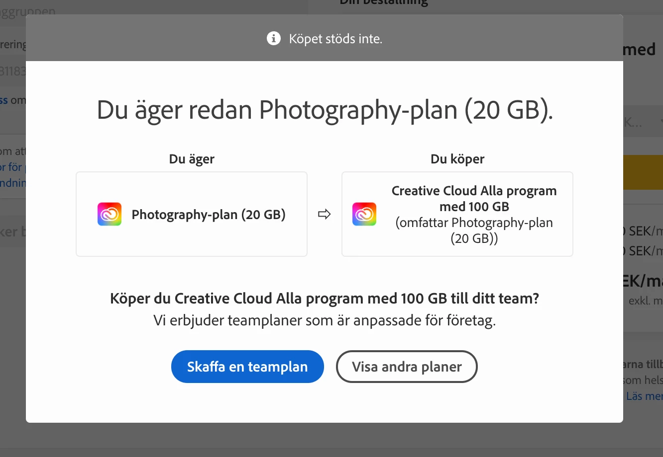 Im trying to upgrade to Creative Cloud (all apps) for individuals from a Induvidual Photo plan but it insists that i need to upgrade for Team. I want the individual. Not the team version. Anyone who knows whats wrong?