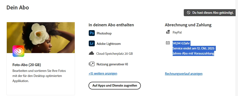 Auf der Account-Seite steht im Block über mein Abo: "Du hast dieses Abo gekündigt."