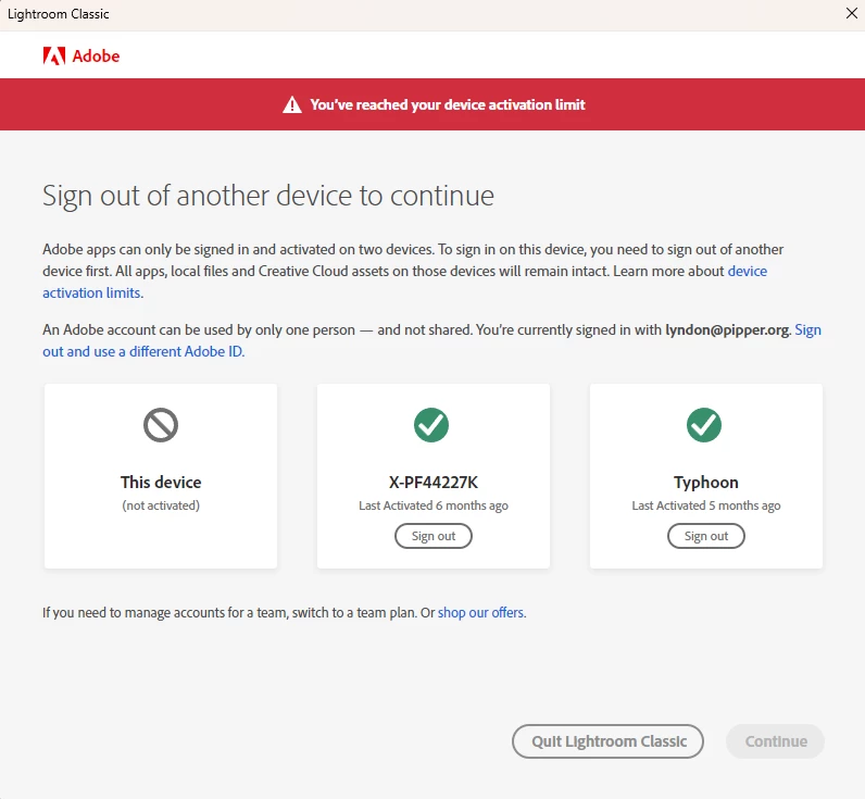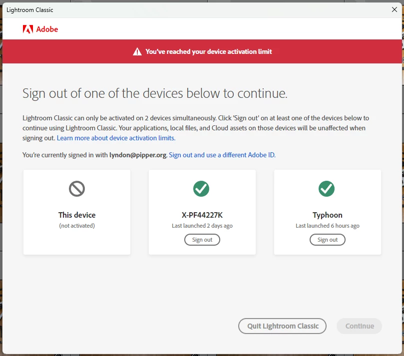 Everytime, and I mean really everytime I wake my computer form sleep, any Adobe software, in this case Photoshop, Lightrom or the Creative Cloud desktop make me sign-in which in the first two cases I do now with a passkey, it tells me I overused my allowance of two machines. One is my work machine, which seems to work flawlessly and the other is this, my home computer (typhoon), which isn't recognized in this moment (see screenshots). So I sign the other "Ghost" computer out and can proceed. But then I get the stupid "We can’t verify your subscription status." message with error code 18000. Reason being it cannot reach the internet. Hellooo, doesn't the sign-in only work with an internet connection?! According to error code articles it says 18000 means I'm running a virtual machine! No I'm not, it's a bare metal installation! Oh yeah, before you ask using another sign-in method (Password/MFA with SMS or Email code) doesn't help either. It's anyway also ridicoulus that the Creative Cloud Desktop app doesn't support passkeys, is it using another older version of the authentication system? There, after sign-in it even actually says, I've just been signed out, I need to sign-in, WTF!!!