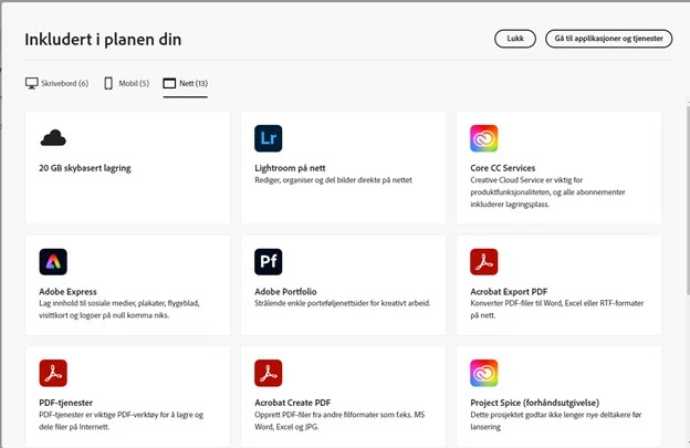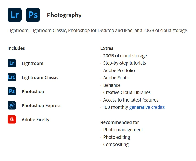 I see you have a Photography plan (20 GB) under the same ID as with forums. I have attached an image to let you know what apps are included in your plan:
