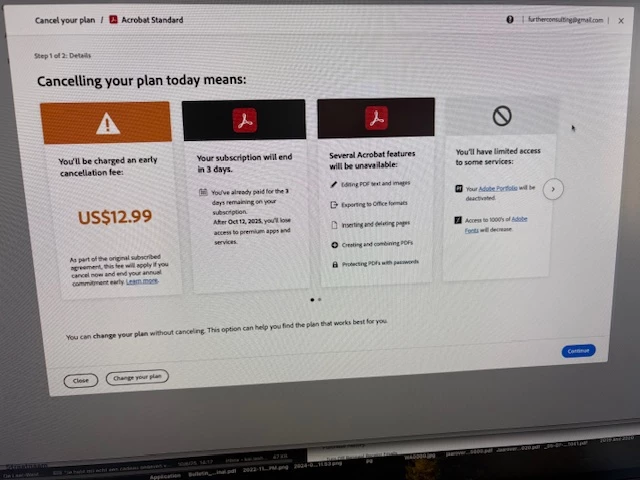 I wish to cancel my Adobe subscription, Acrobat Standard, prior to the automatic renewal on 12 October 2025. When I attempt to do this today, 9 October, 2025, I am told that I will have to pay a cancellation fee of 13 USD (see screenshot), which is basically a charge for an extra month with no access to the services.