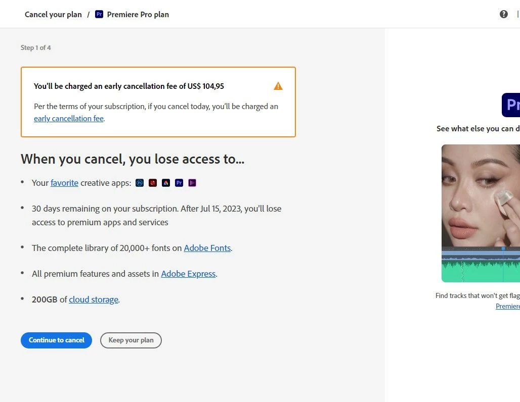 Hello guys, I need your help, I bought Premiere Pro Yesterday (15th June 2023) by mistake because I also have the Creative Cloud subscription which means before the cancellation fee actually applies but they're telling me that I have to pay 104$ (by the way this is an Annual plan, paid monthly.