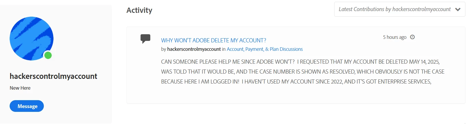 CAN SOMEONE PLEASE HELP ME SINCE ADOBE WON'T? I REQUESTED THAT MY ACCOUNT BE DELETED MAY 14, 2025, WAS TOLD THAT IT WOULD BE, AND THE CASE NUMBER IS SHOWN AS RESOLVED, WHICH OBVIOUSLY IS NOT THE CASE BECAUSE HERE I AM LOGGED IN! I HAVEN'T USED MY ACCOUNT SINCE 2022, AND IT'S GOT ENTERPRISE SERVICES, DEVELOPER CRAP AND TEAMS SET UP IN IT NOW, WHICH IS BEING USED BY HACKERS, AND I JUST WANT IT GONE! HOW DO I ACCOMPLISH THAT?? I'M NOT A TECHY, I'M DISABLED, I'VE BEEN A TARGET OF RELENTLESS HACKING AND STALKING SINCE 2013, AND I'M BEYOND SICK OF IT. PLEASE ADVISE.