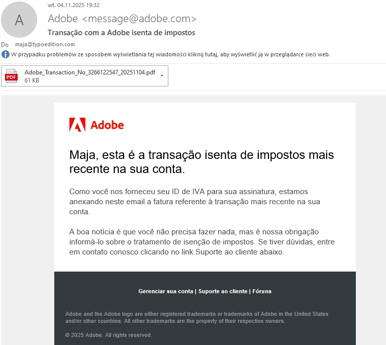 Hi, for last few months I'm getting invoices from ADOBE in Portugese. All invoices were send to me in English so far. I use Polish and English in my profile (that was set for last 5 years), so I have no idea where did that language change came from. I have contacted Adobe Support on chat - they asured me that they have changed it and now I will get invoices back in English on my email... it was twice, the same situation for Adobe Assets invoice and few weeks later for my CC subscription. Today I got another invoice for ADOBE Stock Assets - in Portugese again, the whole email was writen in Portugese. Please help... anyone?
